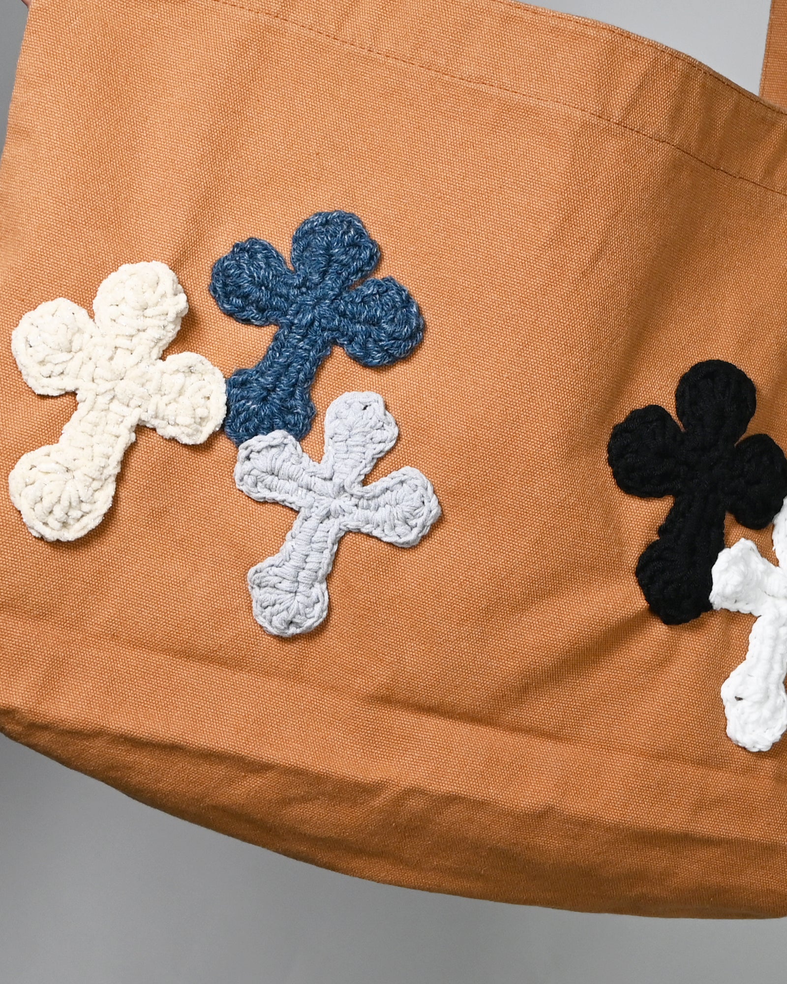 フロント全体にカラフルなニットパッチが施され、トートバッグの柔らかな風合いとのコントラストが印象的な一着です。パッチはすべて異なるカラーコンビネーションで構成されており、一点ごとに異なる個性を持つ“アートピース”のような仕上がりとなっています。